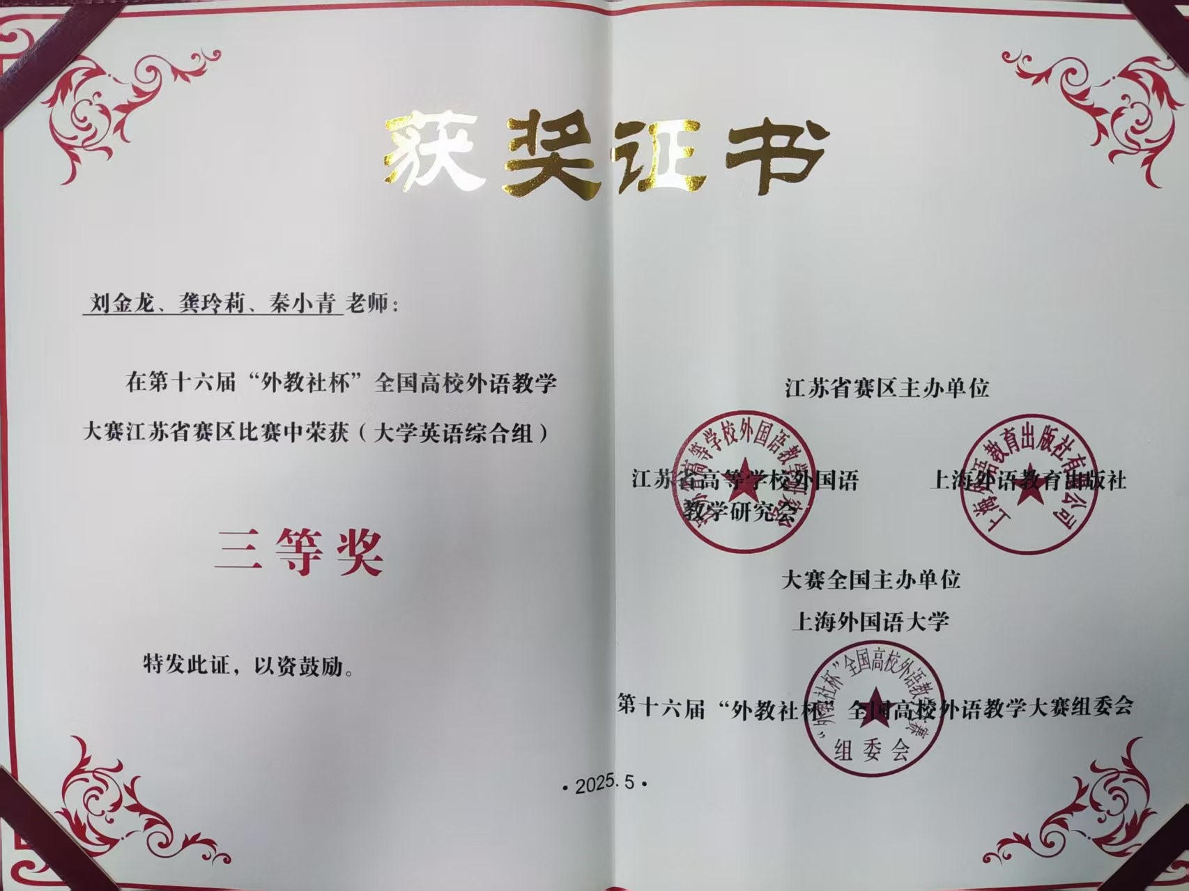 我校教师团队在第十六届“外教社杯”江苏省赛区决赛中取得好成绩5月16日至18日,第十六届“外教社杯”全国高校外语教学大赛江苏省赛区决赛在泰州学院圆满落幕。我校外国语学院丁婷、刘金龙、汪馨菲、杨浩然所代表的四支教学团队,分别参加大学英语视听说组、大学英语综合组、本科英语专业组和研究生英语组等四个组别的比赛,经过激烈角逐,在大学英语视听说组、大学英语综合组中取得三等奖的好成绩。作为国内外语教学领域的权威赛事,“外教社杯”大赛以“引领教学创新、服务教育强国”为宗旨... 2025.05.26