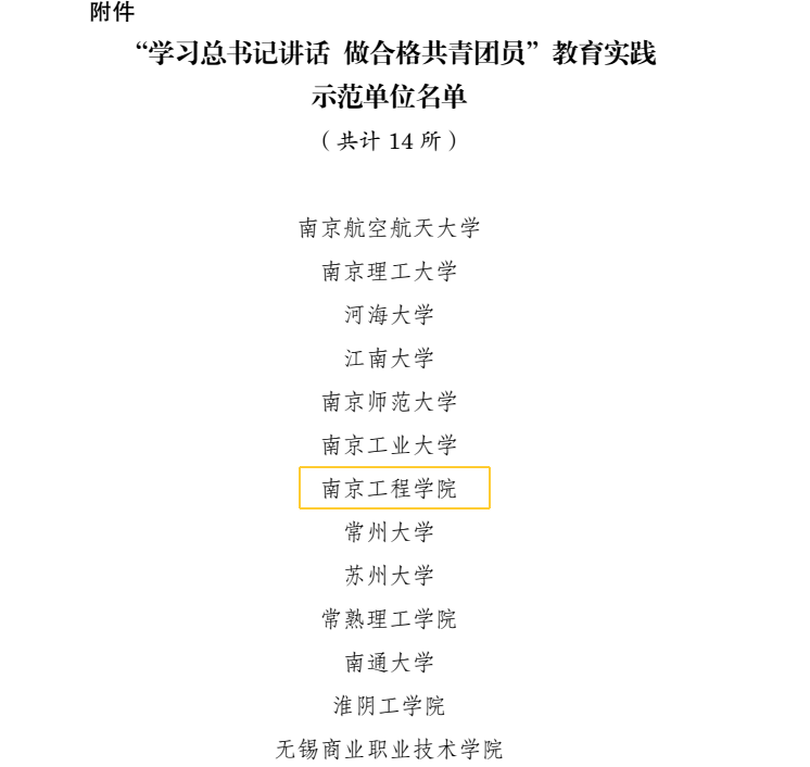 日前,共青团江苏省委发布《关于公布“学习总书记讲话 做合格共青团员” 教育实践示范单位名单的通知》,全省共有14所高校被列为“学习总书记讲话 做合格共青团员”教育实践示范单位,我校位列其中。