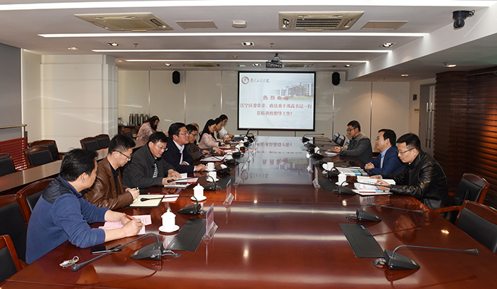 3月12日下午,江宁区委常委、政法委书记于茂高,江宁区司法局局长刘春明,江宁区政法委办公室主任姜金明来我校调研指导平安校园建设工作。我校党委书记史国君、副院长张仰飞热情接待了于茂高一行。