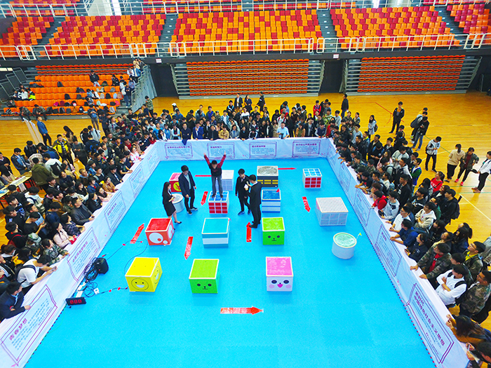 说起这个将小游戏元素融入主题实践活动的创意,主创人员徐淳钰同学特别兴奋,“年初‘跳一跳’刚流行的时候,我看过团中央的一条微信,从‘跳一跳’中延伸到对人生哲理的解读,觉得特别有趣。开学以后就开始琢磨能不能把这个流行元素和主题学习活动结合起来。”“春暖花开,正是运动和学习的好时机。我们不如把‘跳一跳’搬到体育馆来吧,配上有奖答题,游戏、运动、学习三不误。”徐淳钰的创意很快得到了分团委老师的支持。在老师的帮助下,徐淳钰、施皓、傅亚启几个同学忙乎开了,写策划、找道具、设计问题……。为了寓教于乐,引导同学们感悟十九大、思考新时代新青年的责任与担当,大家在设计问题时动足了脑筋。据介绍,活动共设计了四轮题目,分别是诗词浅赏、党团小知识、成语竞猜和“厉害了我的国”即兴演说。“玩过手机‘跳一跳’的都知道,游戏小人在一些特殊的小盒子上停一停是可以加分的,在我们现场版的小盒子上停一停、答对了问题同样也可以加分,寓意着新时代的大学生,不能两耳不闻窗外事,还要坚定信念、培养品格、开阔视野,这些都是青春的加分项。”电力凯发分团委书记的解释,说出了活动策划者的良苦用心。