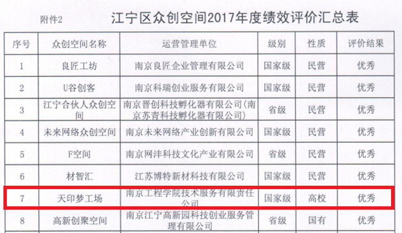 近日,江宁区科技局发布《关于公布2017年度众创空间、科技企业孵化器绩效评价结果的通知》,我校“天印梦工场”众创空间喜获2017年度众创空间绩效评价“优秀”等级。这是自江宁区去年实施绩效评价工作以来,我校连续第二次荣获该项荣誉。