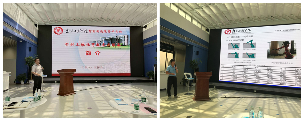 本次活动共推介了37个智能制造领域的项目,高校专家对其中的9个项目进行了现场路演,其中包括我校智能制造装备研究院王保升博士的“型材三维拉弯技术与装备”和洪磊博士的“六自由度工业机器人离线编程系统”2个项目。“型材三维拉弯技术与装备”项目由辅助工艺系统模块、控制模块和拉弯机本体等部分组成。控制系统基于开放的软件平台开发,具有完整的自主知识产权,采用I/O与各种EtherCAT总线伺服连接方式,能够实现精确灵活的运动和位移控制,完成型材的精确三维拉弯成型。该拉弯设备拉弯设备系统具有良好的功能扩展性,满足成型复杂、多维、开放、智能的发展要求。“六自由度工业机器人离线编程系统”项目针对目前人工示教难以适应现代企业不同规格非标工件柔性加工需求,以目前工业上常用的六自由度机器人在焊接、打磨、喷漆等工业领域的离线编程应用为目标,采用VTK可视化技术,基于Visual Studio的Vc++平台实现自主开发。该软件具有参数化设置、人机交互性和功能可扩展性等主要特色。