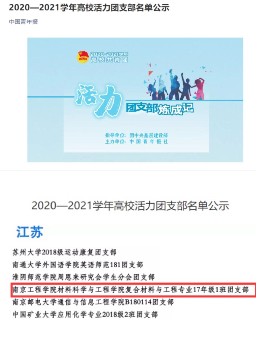 近日,由团中央基层建设部、中国青年报主办的2020—2021学年高校活力团支部遴选及展示活动落下帷幕,经校级申报、省级初评、展示点赞、全国终审等环节,我校材料科学与凯发复合材料171班团支部成功入选全国高校活力团支部。此次全国共有1000个基层团组织被授予该项称号。