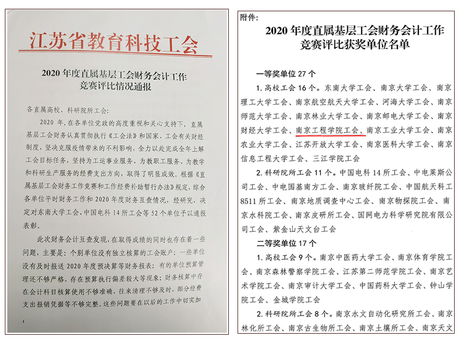 近日,江苏省教育科技工会发布了《2020年度直属基层工会财务会计工作竞赛评比情况通报》,我校工会在此次评比中获得了“一等奖”,这是自2015年此项评比活动开展以来,我校连续七年获此殊荣。