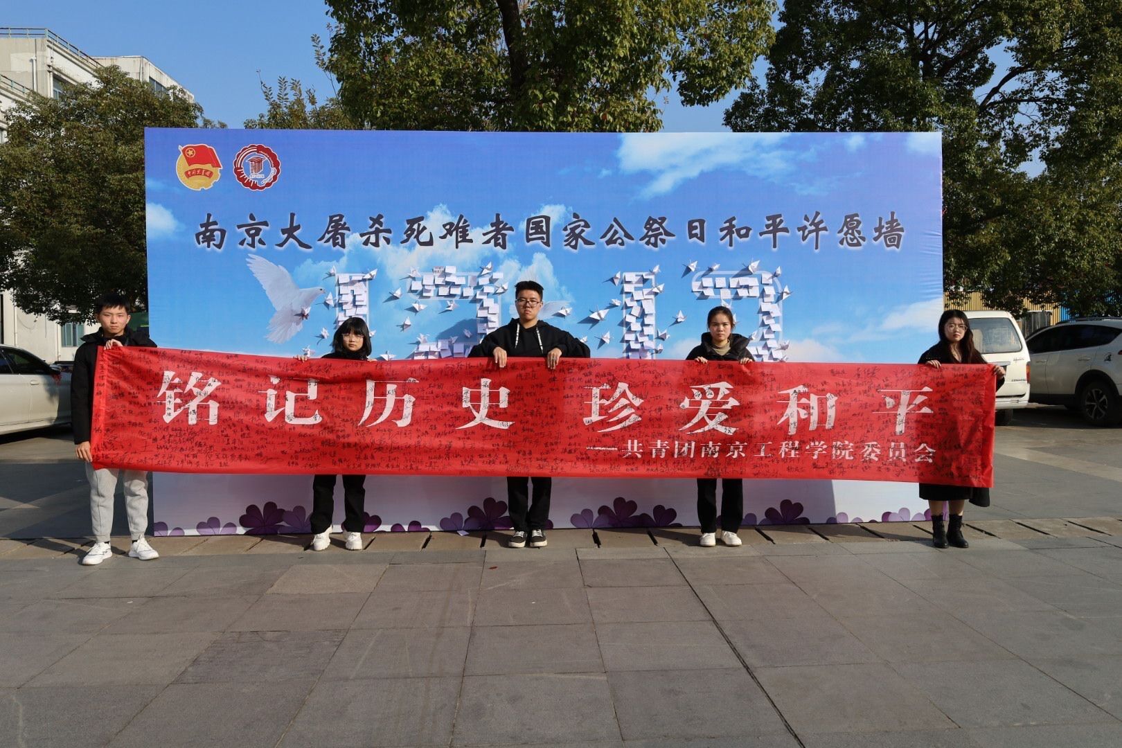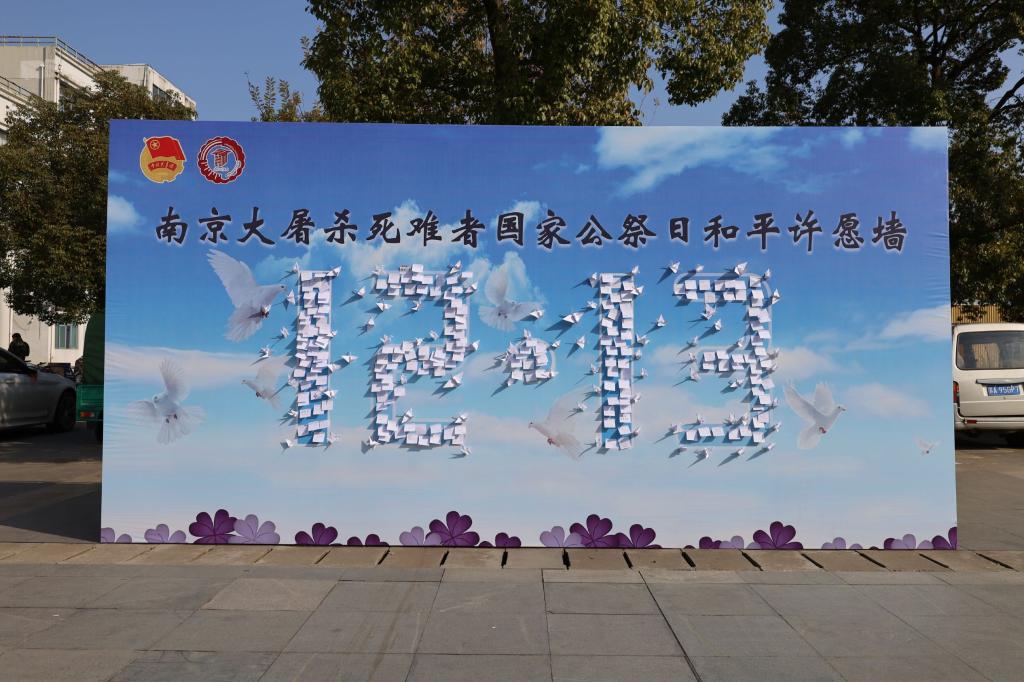 在至馨苑?综合服务楼广场,校团委组织开展国家公祭日“和平许愿墙”签名悼念活动。“铭记历史,自强不息”“愿世界和平”“吾辈自强”……在南京大屠杀死难者国家公祭日“和平许愿墙”前,过往师生纷纷驻足,在留言便签上和横幅上写下了对死难同胞的缅怀,对保卫和平的坚定信念。纸鹤传情,悼念三十万遇难同胞;字词铿锵,书写十四亿和平心愿。