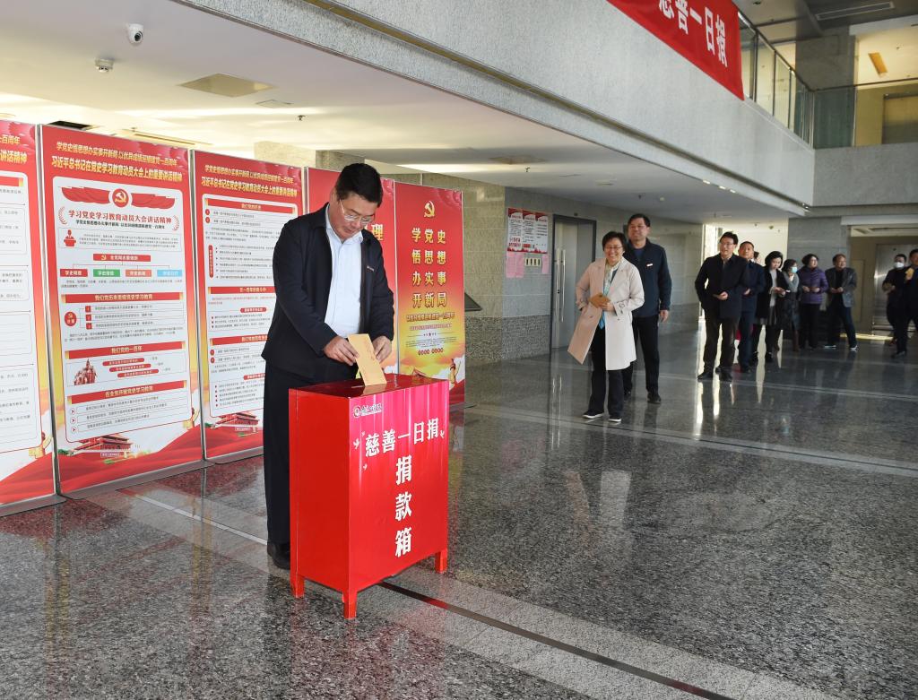 在行政中心一楼大厅,校党委书记史国君带头将捐款投入红色捐款箱中,表达对困难群众的真情关怀,随后校领导班子成员与机关工作人员依次上前,纷纷捐款奉献爱心。