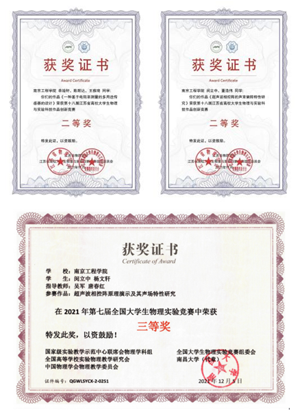 2021年全国大学生物理实验竞赛(创新)和江苏省高校大学生物理与实验科技作品创新竞赛于9月至11月在线上举行。经过ppt陈述、实验演示和答辩三个环节的比拼,我校选派的参赛队伍全部获奖,取得国赛三等奖1项、优秀奖1项,省赛二等奖2项、三等奖2项的好成绩。