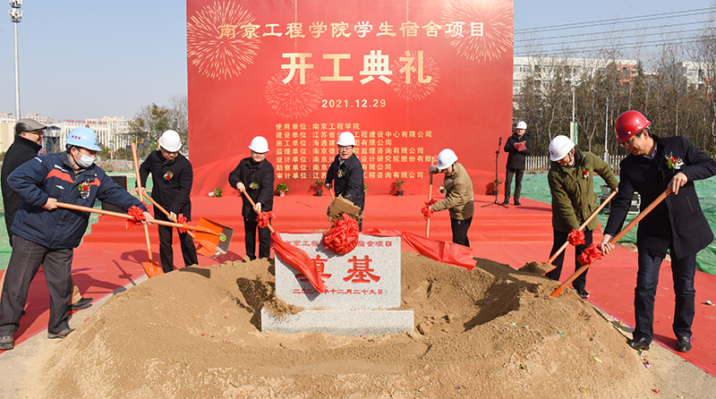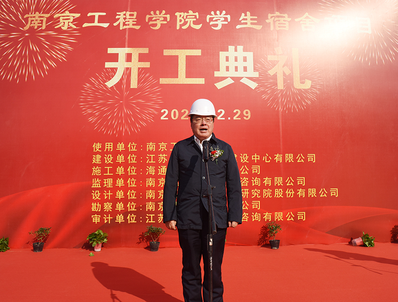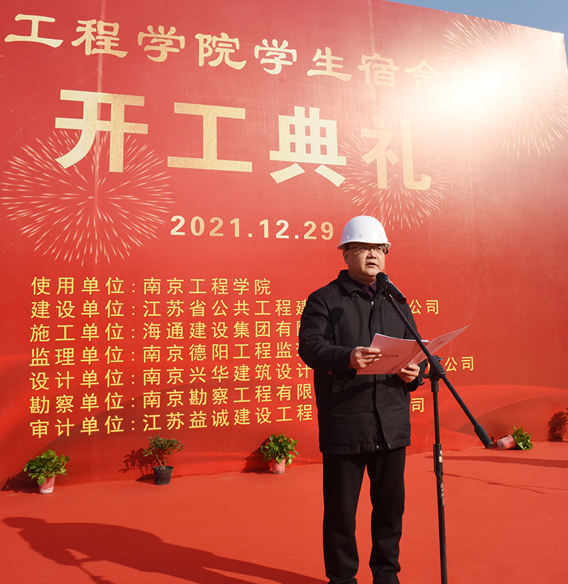 开工仪式在位于校园北侧学生生活区的项目现场举行。我校党委书记史国君,党委常委、副院长杨征宇、朱晓春,省住房和城乡建设厅集中建设处处长曹良春,省公共工程建设中心有限公司副总经理娄永峰,海通建设集团有限公司总经理董善勤,南京兴华建筑设计研究院股份有限公司院长陈卫新,南京德阳工程监理咨询有限公司副总经理方明,南京勘察工程有限公司总工李树德,江苏益诚建设工程咨询有限公司总工汪义平等出席开工仪式。开工仪式由省公共工程建设中心工程管理部副总经理梁石主持。