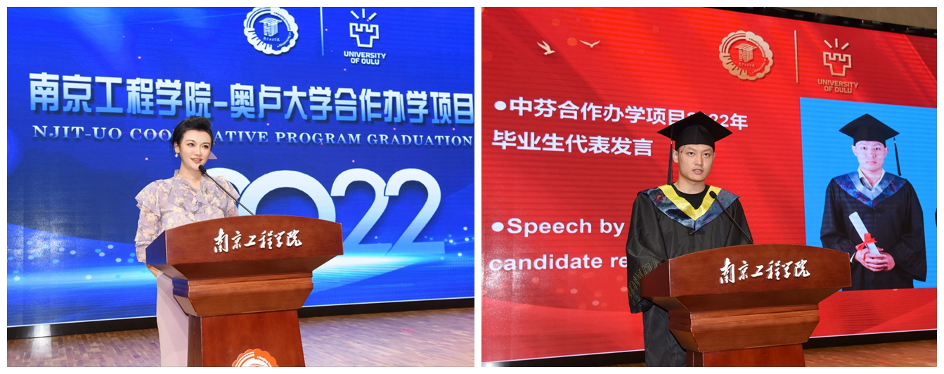 中方教师代表、国际教育学院田源,奥卢大学教师代表Markku Oivo、Jouni Markkula以及中芬合作2022届毕业生代表刘颖分别在典礼上发言,共同回忆大学生活点滴,表达惜别之情和对未来的美好祝福。