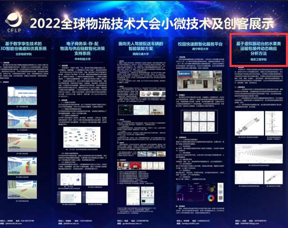 日前,我校经济与管理学院供应链与创新管理研究所杜恒老师的发明成果“基于虚拟振动台的水果类运输包装件动态响应分析方法”在2022年全球物流技术大会上进行了展示。据悉,全球物流技术大会已连续成功举办六届,是全球前沿物流技术的汇聚地和风向标。