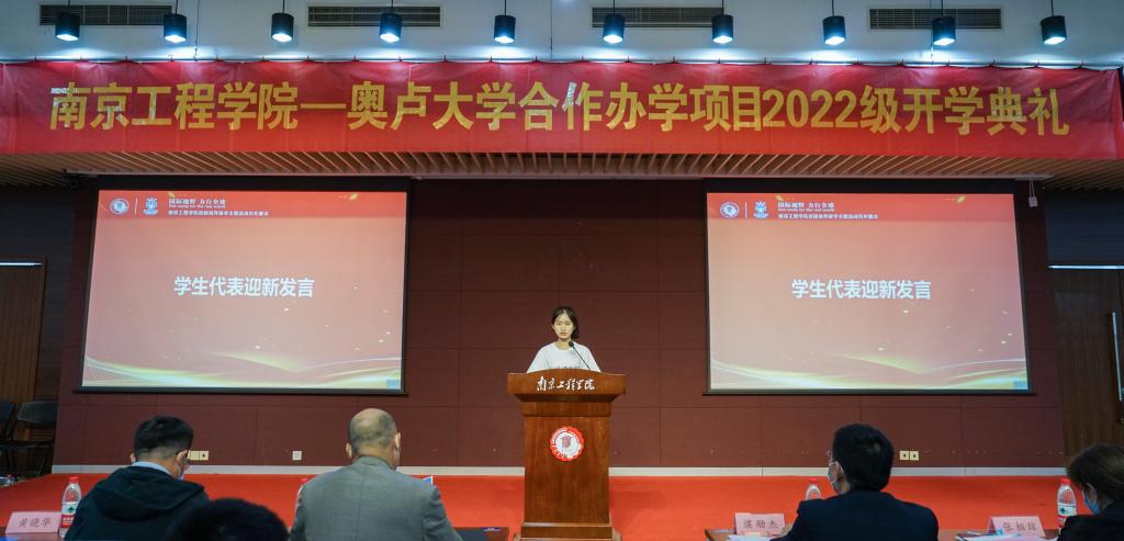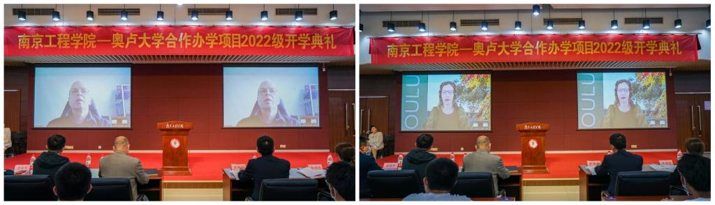 由于疫情原因,奥卢大学的领导和教师无法来到现场,他们通过云端连线表达对新生的祝福。奥卢大学中芬项目负责人Jouni Markkula教授在致辞中表示,中芬合作办学项目体现着开创精神、国际视野以及世界一流的教育水平,致力于为每个学生提供国际化体验。希望同学们能够锻炼出“全球视野、学以致用”的行为范式,成长为有能力引领未来的杰出青年。奥卢大学教师代表Virpi Viio女士勉励新同学们要努力学习,相信自己,勇于探索。通过接收有趣并具有挑战性的学习内容,勤学苦问,培养出真正的学习热情。希望学生获得实用技能,在学业和职业生涯发展中都能收益颇丰。