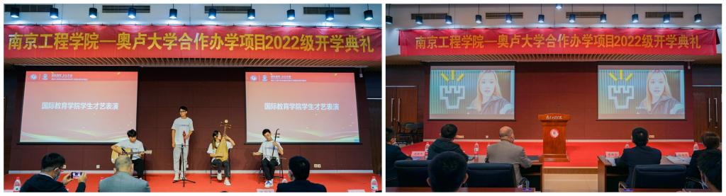 学院首届毕业生代表通过视频对2022级新生的加入表示欢迎,他们鼓励学弟学妹们树立目标,做好大学规划,并为之努力拼搏。在校学生则以一曲民乐小合奏《太湖美》为新生送上祝福。