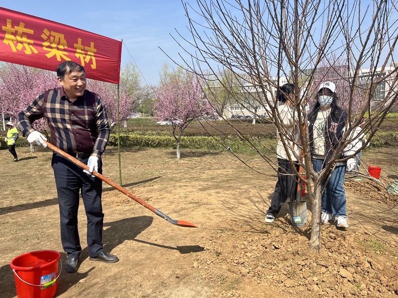 “每年这个时候,我们一起参加义务植树,不仅是为了建设我们的美丽校园,也是为了在全校特别是青年学生心中播撒生态文明的种子。”校党委书记史国君看着去年栽下的碧桃正茁壮成长,高兴不已。在后勤技术人员的指导下,参与植树的师生分工协作,干劲十足。大家整地挖坑、扶正树苗、挥锹培土、提水浇灌,各道工序有条不紊,现场一派热火朝天的劳动景象。史书记一边劳动,一边不时和周围学生交流,询问同学们的学习生活情况,叮嘱他们要德智体美劳全面发展,不能忽视“劳”的作用,培养劳动意识、环保意识、节约意识,不断锤炼自身意志品质,努力成长为党和人民需要的有用之才。植树间隙,史书记还与后勤相关负责人交谈,关心询问校园绿化、环境打造等情况。他说,绿色是高质量发展的底色,要贯彻落实“绿水青山就是金山银山”的生态发展理念,建立健全长效机制,不断加强校园生态文明建设,凝练传承优秀校园文化,为争创全国文明校园贡献力量。