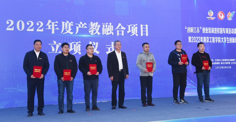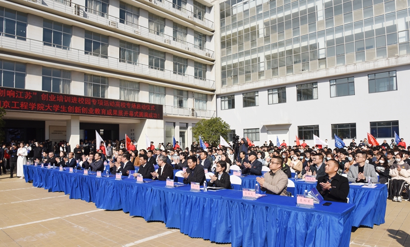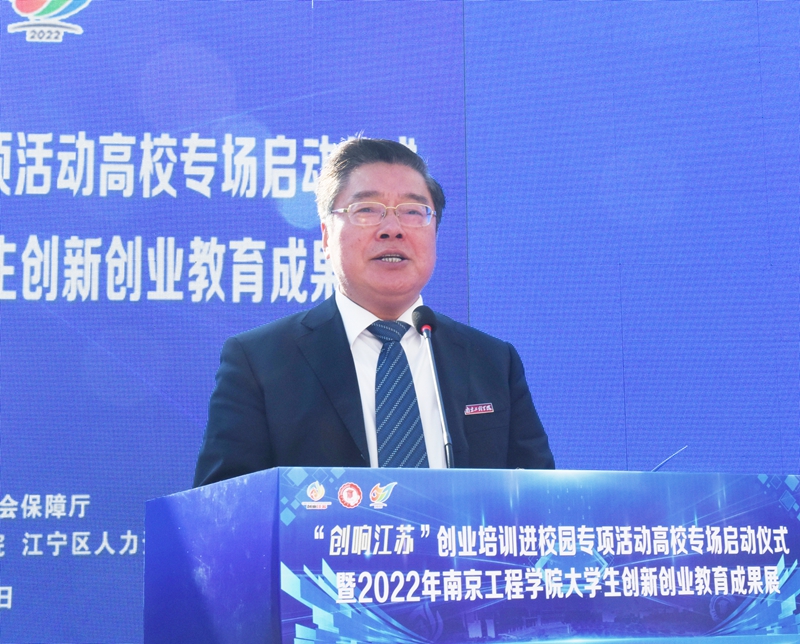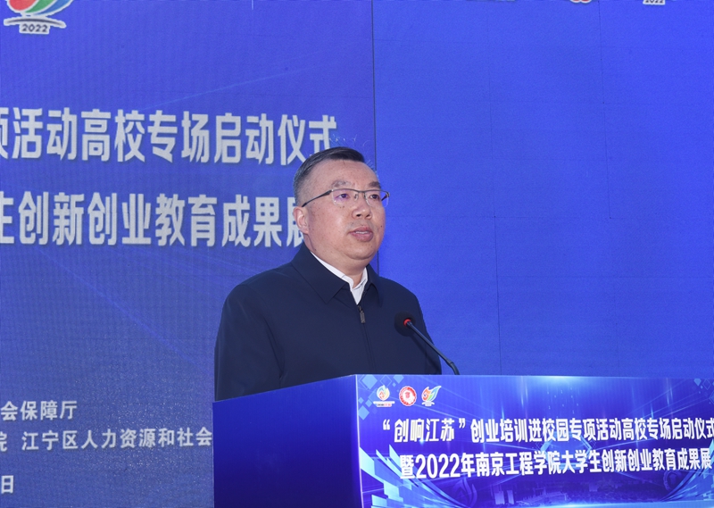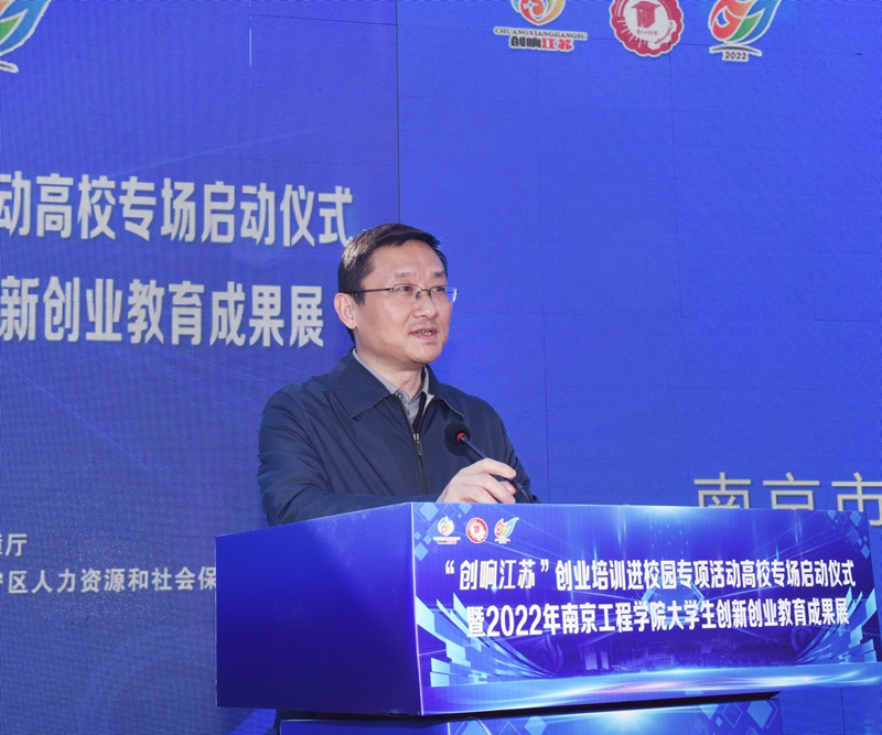 3月13日下午,江苏省“创响江苏”创业培训进校园专项活动启动仪式暨2022年凯发k8官网大学生创新创业教育成果展在我校创新创业学院南广场隆重举行。江苏省人社厅顾潮副厅长,南京市人社局刘莅局长、江宁区副区长万振华,校党委书记史国君,党委常委、副院长张仰飞、郑锋出席活动,省市区人社部门、江宁区政府相关负责人及我校各职能部门、教育教学单位领导、江苏省创业培训导师代表、凯发创新创业导师代表、参展学生和嘉宾评委等近500人参加了此次活动。我校党委书记史国君致开幕辞,省人社厅顾潮副厅长、市人社局刘莅局长分别讲话。