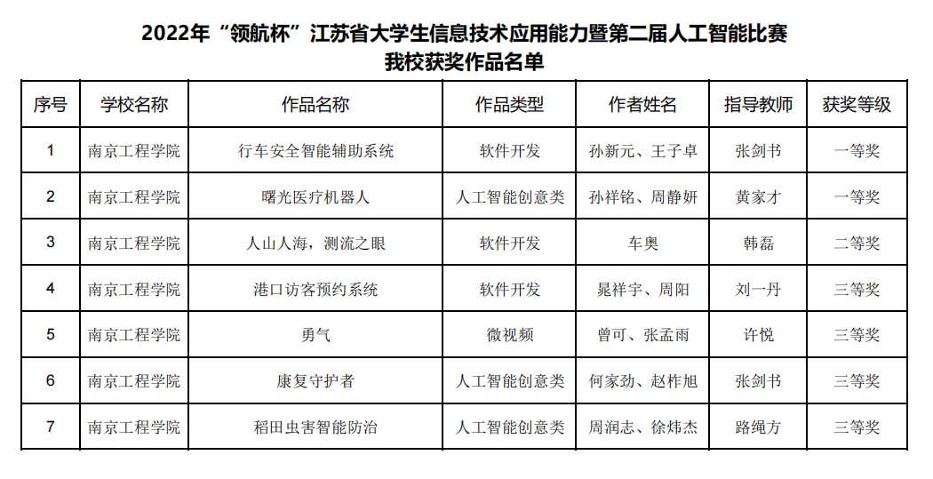 近日,由江苏省教育厅主办的2022年“领航杯”江苏省大学生信息技术应用能力暨第二届人工智能比赛结果揭晓,我校7件作品获奖,其中一等奖2项,二等奖1项,三等奖4项。
