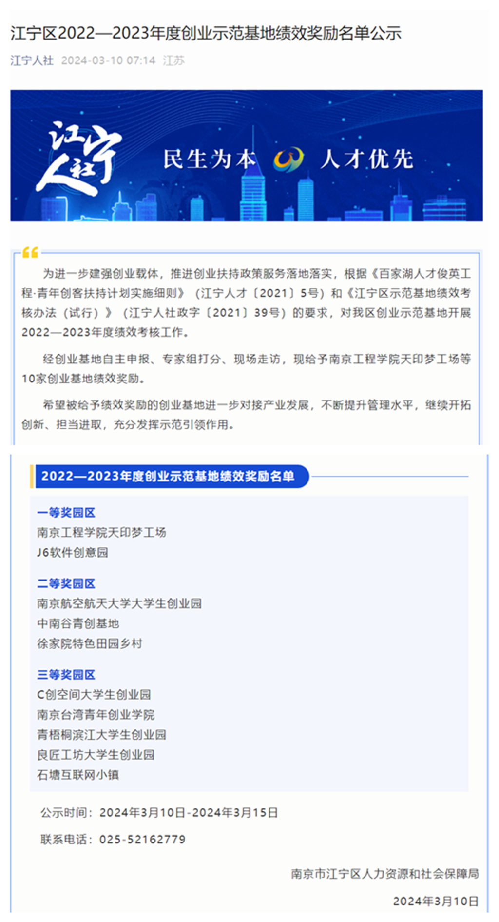 日前,江宁区人社局对2022-2023年度创业示范基地绩效奖励名单进行了公示,我校大学生创业园“天印梦工场”以第一排名荣获一等奖。