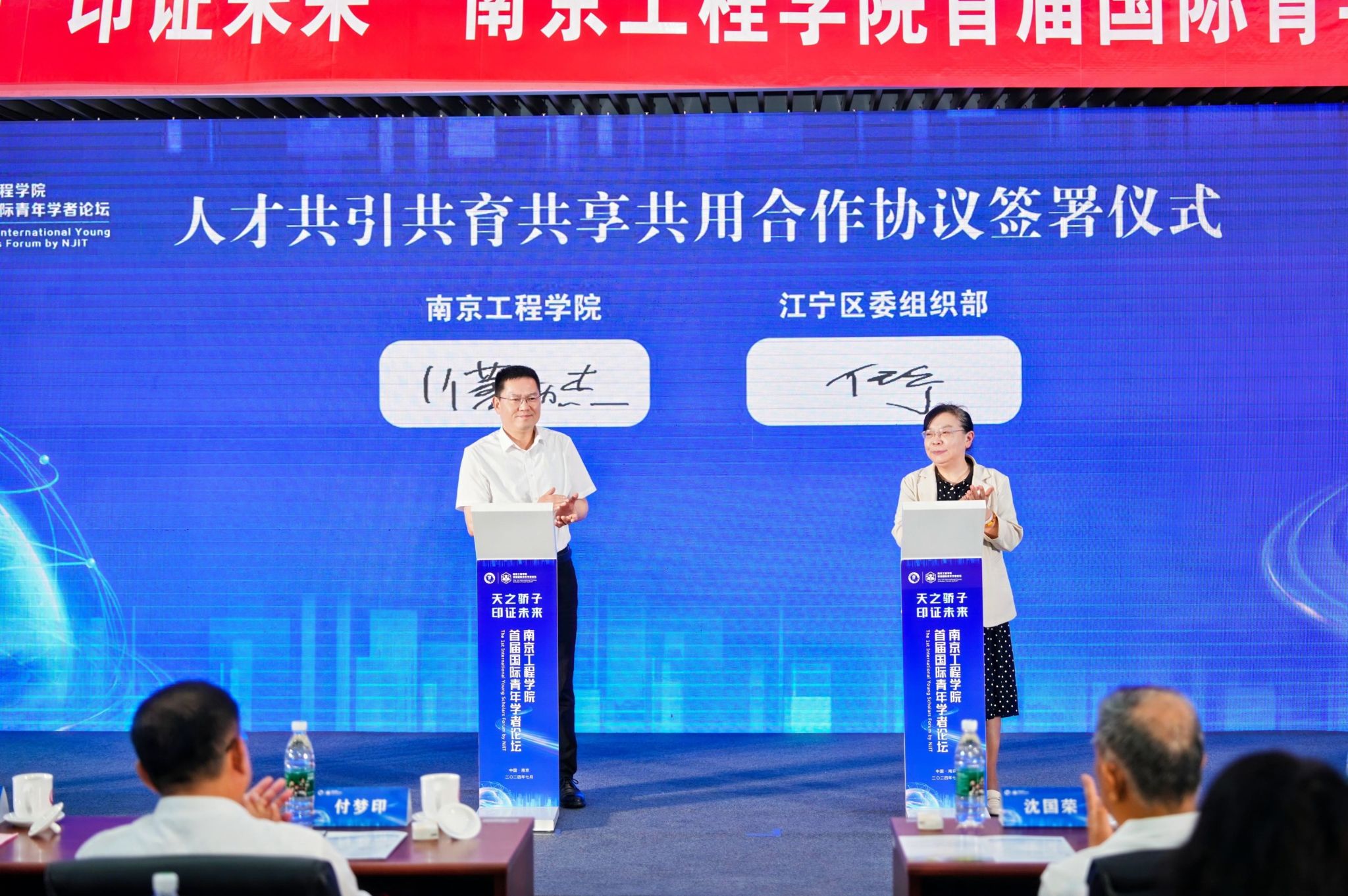 活动现场,江宁区与我校签署人才共引共育共用合作协议。南京南瑞继保电气有限公司、国电南京自动化股份有限公司、南京康尼机电股份有限公司、江苏核电有限公司与我校签署人才引进双聘协议。开幕式上还举行了优秀人才签约仪式。