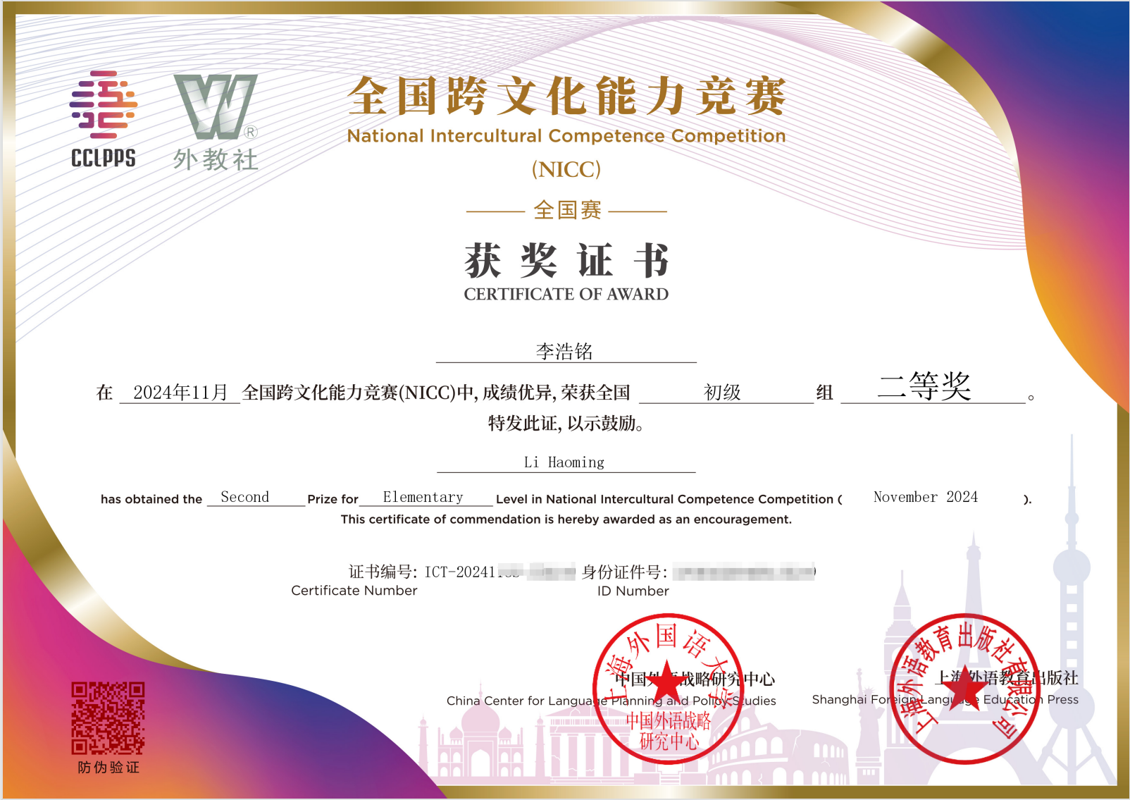 近日,2024年11月全国跨文化能力考试(简称ICT)暨全国跨文化能力竞赛(简称NICC)结果揭晓,我校电力凯发陈康华、建筑凯发李浩铭两位同学在国赛中取得佳绩,分获初级组一等奖、二等奖。