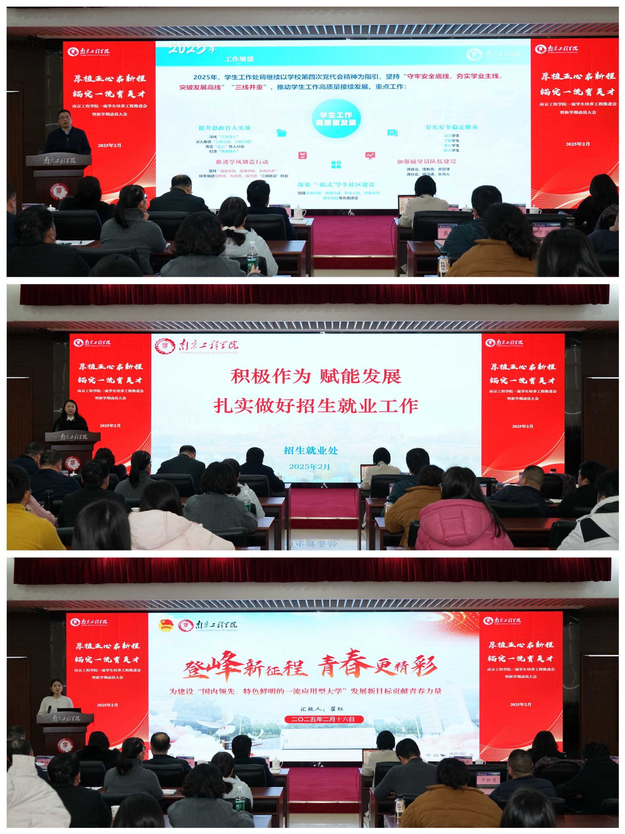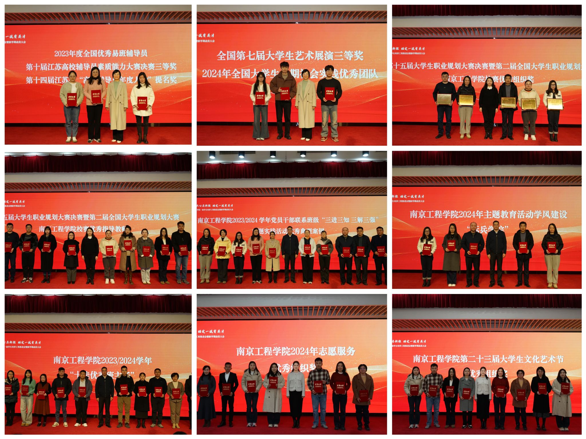 会上,学生工作处、招生就业处、团委分别回顾了2024年的工作亮点与成效,对2025年具体工作进行谋划与部署。各二级学院通过PPT展示了过去一年学生工作方面取得的突出成果。大会还对2024年度在大学生思想政治教育、就业创业、共青团等工作中表现优异的先进集体和个人进行了表彰。