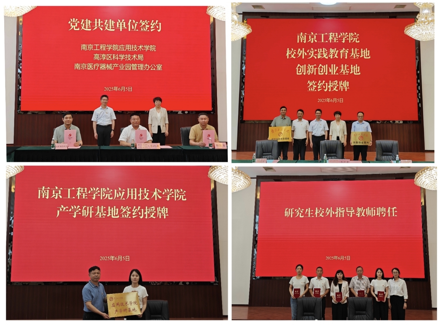 活动现场,高淳区医疗器械产业园管理办、科技局与工程训练中心、应用技术学院签署党建共建协议,并为“校外实践教育基地”“创新创业基地”等产学研平台签约授牌。工程训练中心、应用技术学院智能制造教工党支部、系统集成教工党支部等5个基层党支部分别与瑞杨医用、斯瑞奇医疗等企业党支部结对共建。应用技术学院产学研基地同时挂牌,一批企业技术骨干受聘为我校研究生校外指导教师。