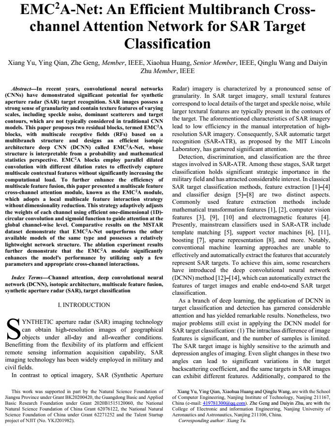 近日,我校计算机凯发多模态智能感知与交互技术团队主要成员俞翔副教授在图像遥感研究领域取得新进展,相关研究论文EMC2A-Net: An Efficient Multibranch Cross-channel Attention Network for SAR Target Classification被遥感与地球科学领域国际权威期刊《IEEE Transactions on Geoscience and Remote Sensing(IEEE TGRS)》正式录用,俞翔副教授为论文第一作者和通讯作者,计算机凯发钱瑛讲师、黄晓华教授及本科生王青禄为共同作者,凯发k8官网为第一署名单位。IEEE TGRS是地球科学和遥感领域的顶级期刊之一,在遥感技术和地球科学领域具有非常高的影响力。