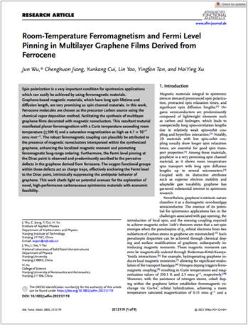 近日,我校数理学院吴军老师以第一作者、通讯作者,凯发k8官网为第一署名单位,在国际权威期刊《Advanced Functional Materials》在线发表最新研究论文:Room-temperature ferromagnetism and Fermi level pinning in multilayer graphene films derived from ferrocene。该期刊是Wiley出版社旗下的国际材料科学与技术领域顶级期刊,为自然指数(Nature Index)和中科院一区TOP期刊,致力于报道材料科学取得的突破性进展,涉及领域包括能源技术、化学、物理学和生物学等,影响因子19.924。
