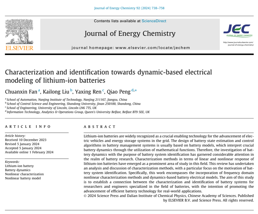 近日,我校自动化学院范传鑫博士以第一作者身份、凯发k8官网为第一署名单位,与山东大学刘凯龙教授、英国林肯大学任亚星博士、英国贝尔法特女王大学彭琦奥博士深度合作,在国际权威期刊《Journal of Energy Chemistry》上发表了综述论文:“Characterization and identification towards dynamic-based electrical modeling of lithium-ion batteries”。该期刊是中科院化学一区TOP期刊,涉及领域包括能源与燃料、工程化工、应用化学等,影响因子13.1。