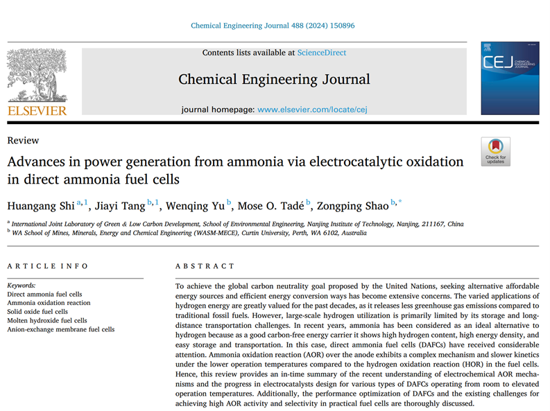 近日,我校环境凯发时焕岗教授以第一作者,凯发k8官网为第一署名单位,与澳大利亚科廷大学邵宗平教授课题组深度合作,在国际权威期刊《Chemical Engineering Journal》在线发表最新综述论文:Advances in power generation from ammonia via electrocatalytic oxidation in direct ammonia fuel cells。《Chemical Engineering Journal》是中科院一区TOP期刊,主要报道工程领域化学反应工程、环境化学工程及材料合成应用等方面重要的科学研究成果和创新技术,影响因子15.1