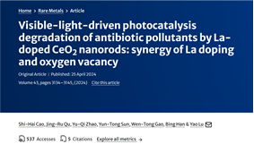 近日,我校环境凯发曹世海副教授以第一作者,凯发k8官网为第一署名单位,先后在国际权威期刊《Rare Metals》和《Journal of Rare Earths》发表两篇研究论文:Visible-light-driven photocatalysis degradation of antibiotic pollutants by La-doped CeO2 nanorods: synergy of La doping and oxygen vacancy和In-situ synthesis of Z-scheme CeO2@WO3 heterojunction with aromatic rings as electron medium for efficient photocatalytic degradation of perfluorobutane sulfonate。《Rare Metals》和《Journal of Rare Earths》均为中科院一区期刊,影响因子分别为9.6和5.2。