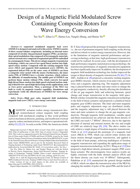 近日,我校智能电网产业技术研究院夏涛老师作为第一作者、通讯作者,刘海涛教授、张仰飞教授、余海涛教授、李子豪为主要合作者,凯发k8官网作为第一单位,在国际权威期刊《IEEE Transactions on Power Electronics》上发表“Design of a Magnetic Field Modulated Screw Containing Composite Rotors for Wave Energy Conversion”的学术论文。该期刊是Institute of Electrical and Electronics Engineers 旗下工程技术类顶级期刊,中科院工程技术一区TOP期刊,专注于电气与电子领域的技术革新与学术动态,影响因子为6.6