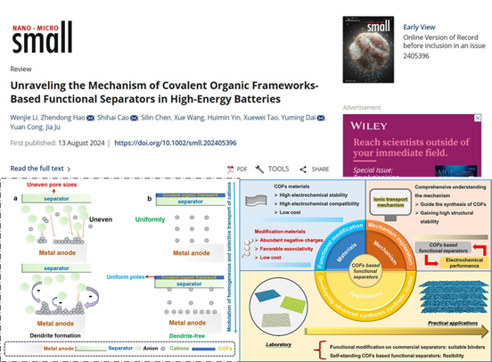 近日,我校材料科学与凯发本科生李文杰为第一作者,郝振东博士、曹世海博士、戴玉明副教授为通讯作者,凯发k8官网为第一署名单位,在国际权威期刊《 Small 》上发表题为“Unraveling the Mechanism of Covalent Organic Frameworks-Based Functional Separators in High-Energy Batteries”的学术论文。《Small》是Wiley出版社旗下的涵盖材料科学、纳米、化学、物理等领域的国际顶级多学科Top期刊,影响因子13。