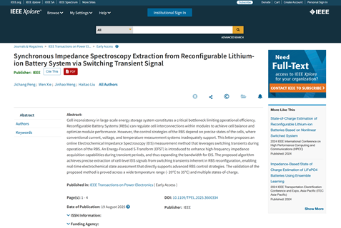 近日,我校电力凯发、沈国荣学院先进储能技术研究团队取得新进展。彭纪昌博士以第一作者身份,与刘海涛教授及研究生谢文协同合作,并联合西安交通大学国家储能技术产教融合创新中心孟锦豪教授,在电气工程领域国际顶级期刊《IEEE Transactions on Power Electronics》上发表了题为“Synchronous Impedance Spectroscopy Extraction from Reconfigurable Lithium-ion Battery System via Switching Transient Signal”的学术论文。该期刊隶属于IEEE,是电力电子与电气工程领域的权威刊物(中科院一区Top,影响因子6.5),长期致力于推动电力电子技术创新与产业应用前沿发展。