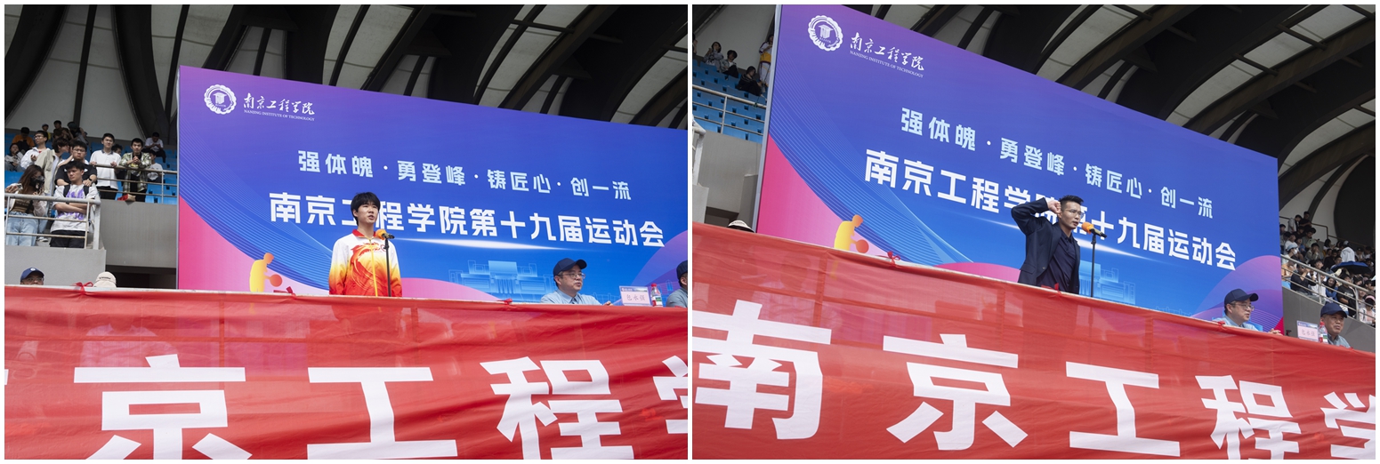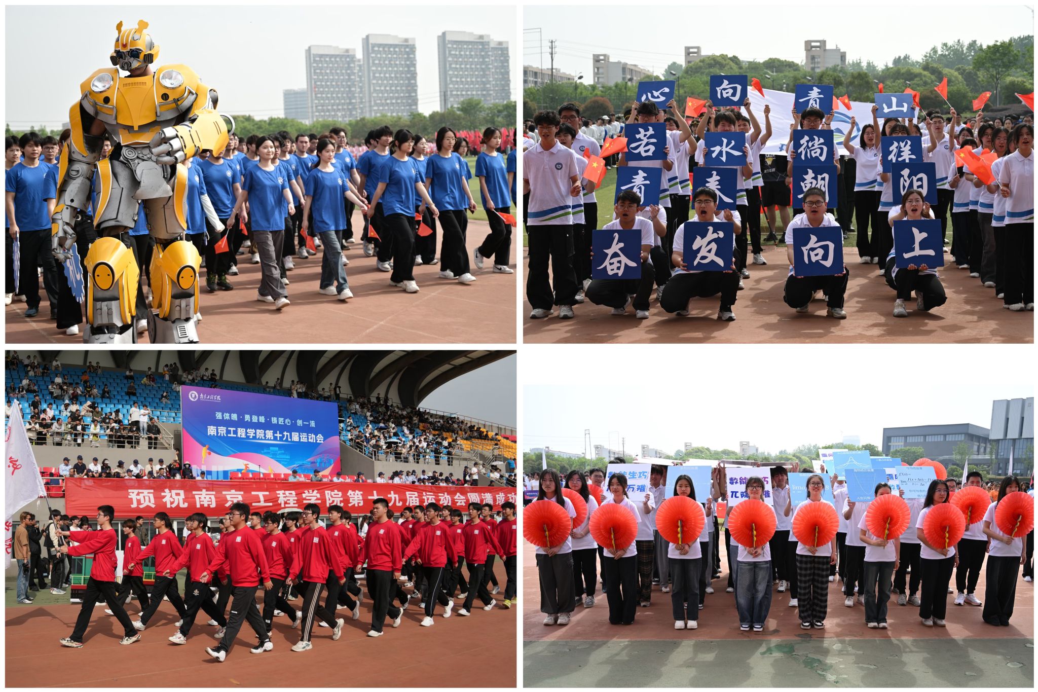 在激昂的运动员进行曲中,国旗、校旗迎风飘扬。由我校师生、大学生创业园入驻企业代表组成的24个方阵依次入场。整齐的队列、嘹亮的口号、创意的风采展示,彩旗与花束交相辉映,充分展现出南工程人积极进取的精神风貌。