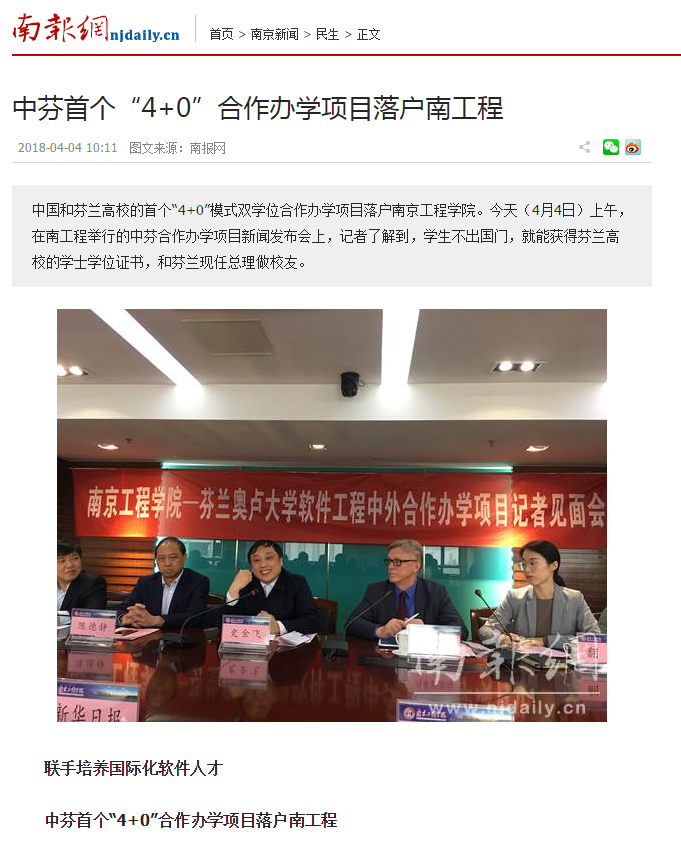 南报网讯(通讯员 张文莉 记者 谈洁)发布会上,记者了解到,南京与奥卢已经结为友好合作城市,未来,南工程还将于奥卢大学合作打造中芬学院。