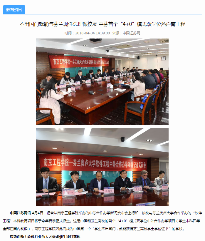 据了解,南工程与奥卢大学已于去年10月签署了“共建中芬学院合作备忘录”,计划在几年内建立“中芬学院”,共同致力于在软件工程、通信工程、计算机科学与技术、信息管理和其它多个专业举办本科、研究生层次的合作办学,努力打造成中芬高等教育合作的样本。关于“软件工程”本科教育项目的录取批次、学费收取以及毕业生深造途径等师生家长关心的事项校方也将于近期公布。