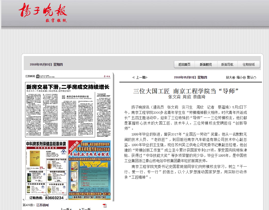 《扬子晚报》:三位大国工匠 凯发k8官网当“导师”