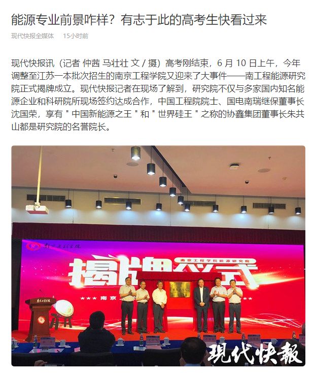 现代快报讯(记者 仲茜 马壮壮 文 / 摄)高考刚结束,6 月 10 日上午,今年调整至江苏一本批次招生的凯发k8官网又迎来了大事件——南工程能源研究院正式揭牌成立。现代快报记者在现场了解到,研究院不仅与多家国内知名能源企业和科研院所现场签约达成合作,中国工程院院士、国电南瑞继保董事长沈国荣,享有 " 中国新能源之王 " 和 " 世界硅王 " 之称的协鑫集团董事长朱共山都是研究院的名誉院长。