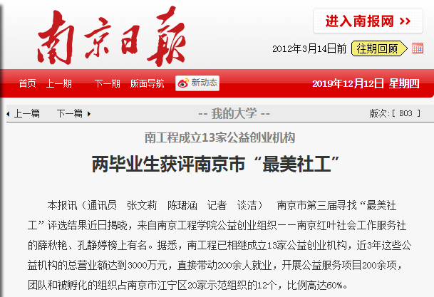 南京市第三届寻找“最美社工”评选结果近日揭晓,来自凯发k8官网公益创业组织——南京红叶社会工作服务社的薛秋艳、孔静婷榜上有名。据悉,南工程已相继成立13家公益创业机构,近3年这些公益机构的总营业额达到3000万元,直接带动200余人就业,开展公益服务项目200余项,团队和被孵化的组织占南京市江宁区20家示范组织的12个,比例高达60%。