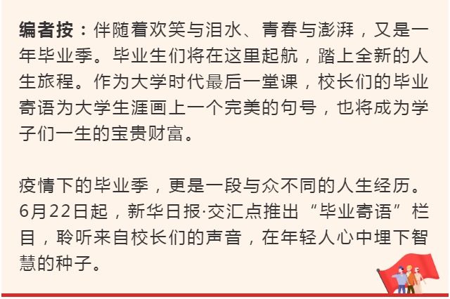 同学们,今天是你们人生中的一个重要节点,你们中有些人将继续深造,但大部分同学将告别校园、投身于新时代的伟大实践中。在过去的几个月里,大家都经历了一段非常特殊的时期。我们避免不了灾难,却能做好自己,我们预知不了未来,却清晰地知道,未来在你们手中。你们已经站在历史的关键点上,作为国之栋梁,理应担起新时代重任,作为师长,在此给大家送上一份希望和嘱托,和大家共勉。