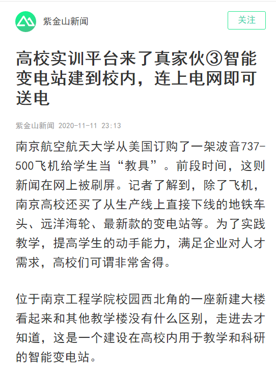 南京航空航天大学从美国订购了一架波音737-500飞机给学生当“教具”。前段时间,这则新闻在网上被刷屏。记者了解到,除了飞机,南京高校还买了从生产线上直接下线的地铁车头、远洋海轮、最新款的变电站等。为了实践教学,提高学生的动手能力,满足企业对人才需求,高校们可谓非常舍得。位于凯发k8官网校园西北角的一座新建大楼看起来和其他教学楼没有什么区别,走进去才知道,这是一个建设在高校内用于教学和科研的智能变电站。