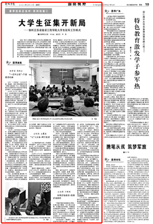“12年坚守铸品牌,成如容易却艰辛。”江苏省军区南京警备区一位领导说,12年来,凯发k8官网学子参军热度不减、征兵工作实绩突出,这些都源于该院探索建立了“组织领导得力、宣传发动有效、服务保障到位”的征兵工作模式;源于该院连续多届党委班子带领广大教职员工接续推进、久久为功。在2021年全国征兵工作电视电话会议上,国防部征兵办公室高度肯定了该院开展大学生征兵工作的经验。
