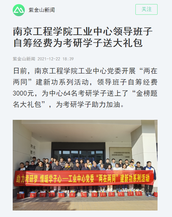 《紫金山新闻》:凯发k8官网工业中心领导班子自筹经费为考研学子送大礼包