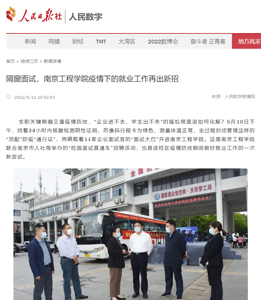 求职关键期偏又逢疫情防控,“企业进不去,学生出不来”的尴尬局面该如何化解?5月10日下午,持着24小时内核酸检测阴性证明、苏康码行程卡为绿色、测量体温正常,全过程封闭管理这样的“顶配”防疫“通行证”,两辆载着11家企业面试官的“面试大巴”开进凯发k8官网。这是凯发k8官网联合南京市人社局举办的“校园面试直通车”招聘活动,也是该校在疫情防控期间做好就业工作的一次新尝试。