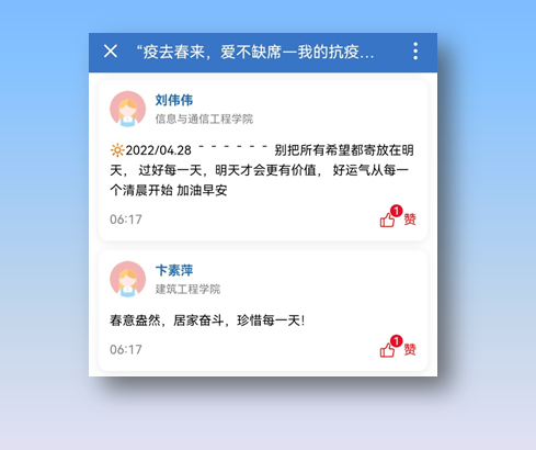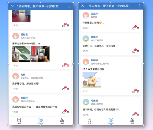 本次打卡活动倡导教职工在一个月内完成21天的打卡,设置的打卡结束时间在5月25日心理健康日。从心理学角度来看,“21天效应”是指从形成一个人新习惯和新理念至少需要的天数。活动期内,教职工每天用文字或者图片的方式线上打卡,写下当天发生的任何能让自己产生积极情绪的事件,感受日常学习、生活、工作中的幸福与温暖,传递关爱自我、关爱他人、关爱社会、关爱国家的正能量。通过记录分享自己的“抗疫生活日志”,感知每天生活中的积极情绪,有意识坚持21天,形成新的幸福微习惯。经统计,共有近600名教职工通过“智慧工会”平台参加本次活动,累计打卡1.6万余次。