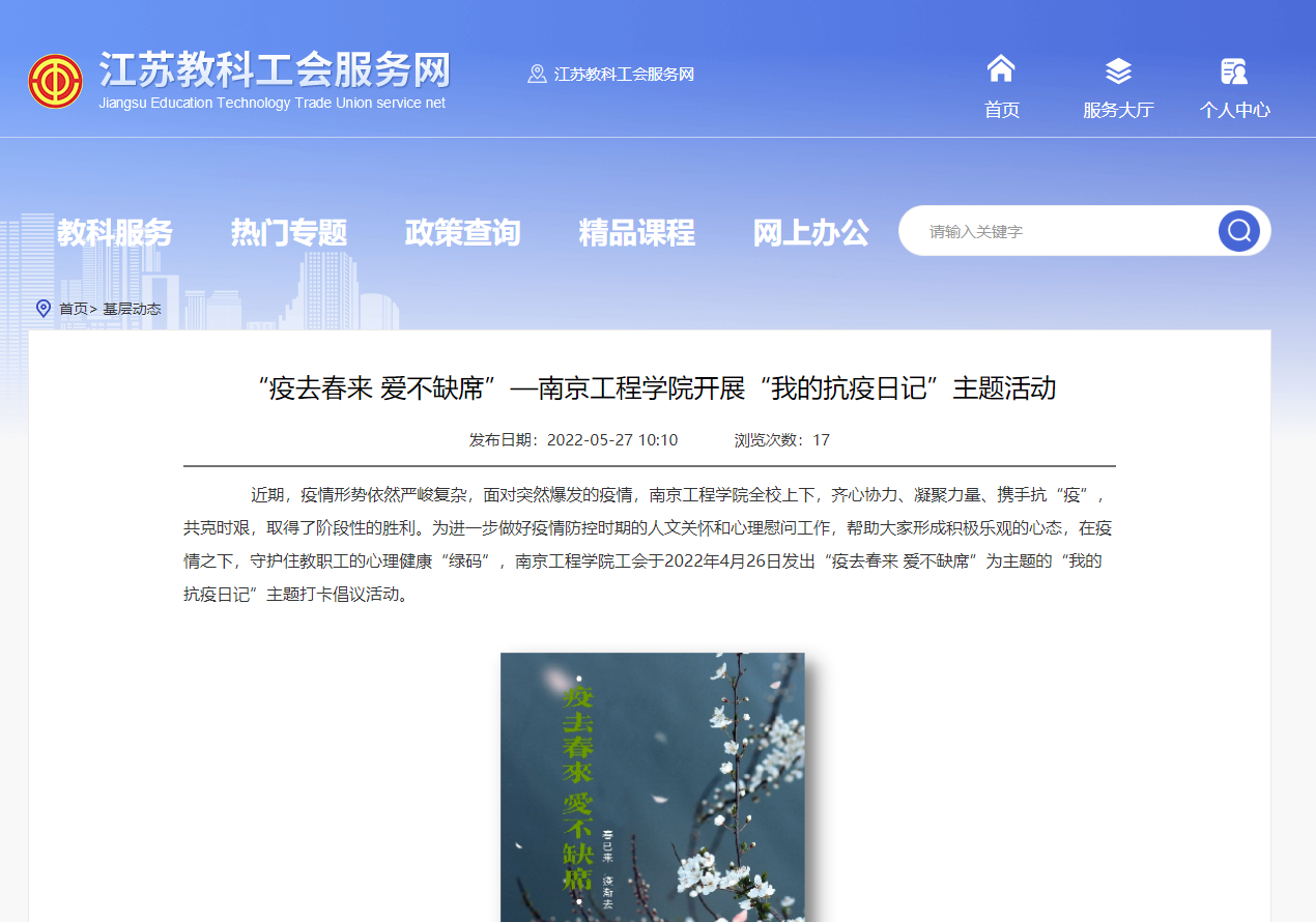 近期,疫情形势依然严峻复杂,面对突然爆发的疫情,凯发k8官网全校上下,齐心协力、凝聚力量、携手抗“疫”,共克时艰,取得了阶段性的胜利。为进一步做好疫情防控时期的人文关怀和心理慰问工作,帮助大家形成积极乐观的心态,在疫情之下,守护住教职工的心理健康“绿码”,凯发k8官网工会于2022年4月26日发出“疫去春来 爱不缺席”为主题的“我的抗疫日记”主题打卡倡议活动。