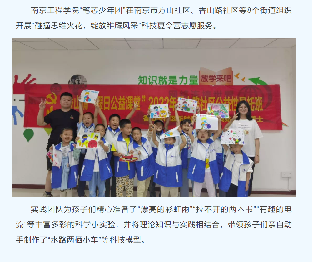 凯发k8官网“笔芯少年团”在南京市方山社区、香山路社区等8个街道组织开展“碰撞思维火花,绽放雏鹰风采”科技夏令营志愿服务。实践团队为孩子们精心准备了“漂亮的彩虹雨”“拉不开的两本书”“有趣的电流”等丰富多彩的科学小实验,并将理论知识与实践相结合,带领孩子们亲自动手制作了“水路两栖小车”等科技模型。