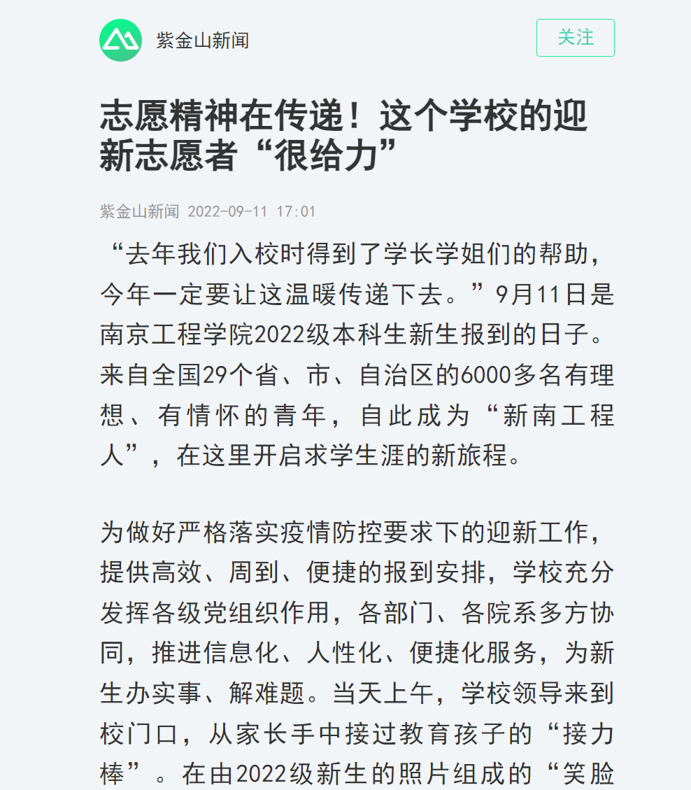 《紫金山新闻》:志愿精神在传递!这个凯发的迎新志愿者“很给力”