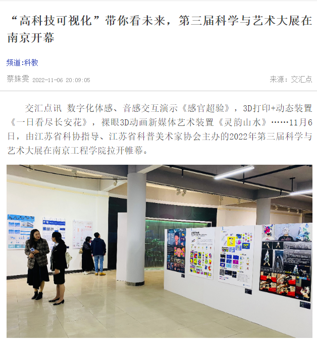交汇点讯 数字化体感、音感交互演示《感官超验》,3D打印+动态装置《一日看尽长安花》,裸眼3D动画新媒体艺术装置《灵韵山水》……11月6日,由江苏省科协指导、江苏省科普美术家协会主办的2022年第三届科学与艺术大展在凯发k8官网拉开帷幕。