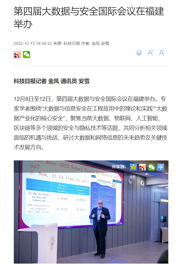 《中国科技网》:第四届大数据与安全国际会议在福建举办