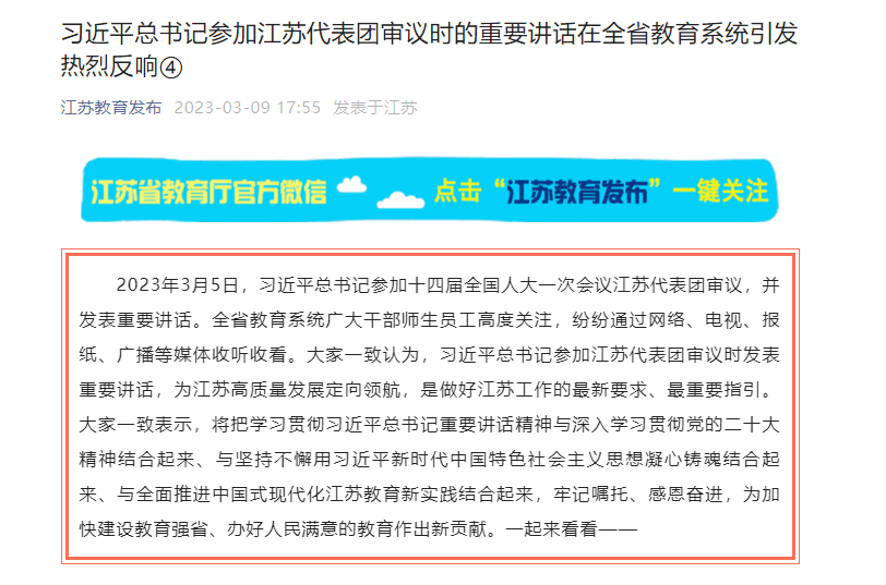2023年3月5日,习近平总书记参加十四届全国人大一次会议江苏代表团审议,并发表重要讲话。全省教育系统广大干部师生员工高度关注,纷纷通过网络、电视、报纸、广播等媒体收听收看。大家一致认为,习近平总书记参加江苏代表团审议时发表重要讲话,为江苏高质量发展定向领航,是做好江苏工作的最新要求、最重要指引。大家一致表示,将把学习贯彻习近平总书记重要讲话精神与深入学习贯彻党的二十大精神结合起来、与坚持不懈用习近平新时代中国特色社会主义思想凝心铸魂结合起来、与全面推进中国式现代化江苏教育新实践结合起来,牢记嘱托、感恩奋进,为加快建设教育强省、办好人民满意的教育作出新贡献。一起来看看——
